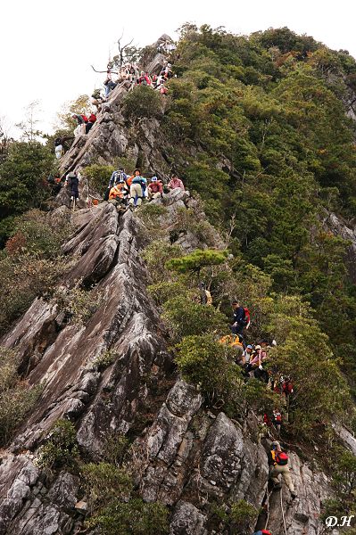 而我們提早下山是對的,因為早上從稍來山看過紅榨槭之後的另一組大隊人馬正朝著鳶嘴山方向而來。其實我選從27.05k傳統入線上鳶嘴山,就是想要跟主要的登山人群同一個方向,這樣才不會不斷的會車。總之,我們正好下了最後一段岩壁鐵環的陡崖,從稍來山過來的人群已經在底下等著要過來了,直嚷讓著要進行交通管制。後來我回望剛才那段陡降的路線,在鳶嘴山用過中餐的大隊人馬也正要下山來了。在這種一夫當關萬夫莫敵的陡崖,看來兩方人馬是有的對峙了,要能完全通過,起碼有一方得等個一個小時。