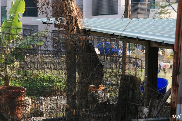 實際一遊,東門路真是一條很適合散步的巷子,果然有許多荒地,有一些菜田,有一兩處果園,有一個路口有幾棵松樹,有一個路口住家牆壁上爬有榕樹密密麻麻的根、東門路沿途走來路旁或都或少都有栽種龍眼樹,隱約嗅得到以往鄉村農路的味道。快接近鐵道旁的路口左邊有一塊籬笆圍起來的區域,旁邊有一條水溝(現在對水溝很敏感),籬笆內有「菱角」的牌示,我心想果然有菱角,而且真的有看到幾個人在插秧,嗯,在都市中種稻種菜,旁邊是新蓋的別墅,很強烈的對比。其實左營火車站附近還能看到一些生產農作物的農地,雖然新建案正在鯨吞蠶食這些區域。