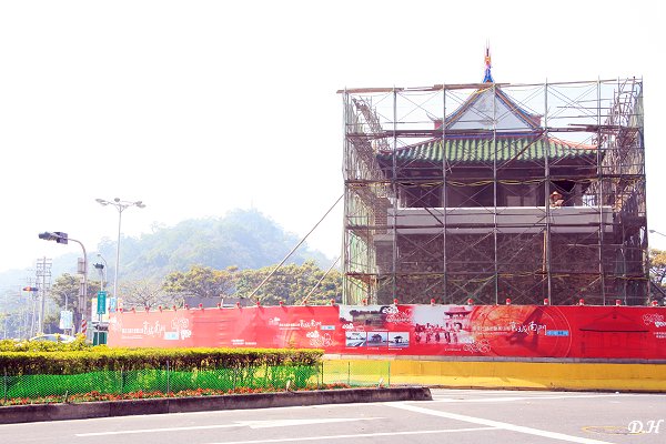 昨天訪問了鳳山縣舊城東門,但來不及訪問同屬一級古蹟的南門,今天便決定走訪南門,不過從翠華社區穿出來到南門圓環,卻見南門正在整修,而在施工鷹架與護網上頭的南門城樓已經算整修完成,露出美輪美奐的燕尾翹脊與屋頂的寶珠,都是重新上漆彩繪過的。南門名為「啟文門」,民國五十年整修時,石階與城樓階皆後來興建已失原制,這一次再度整修,我好像有看到文史人士在城門上對照施工狀況的樣子,不知道是不是會依照舊制還原?