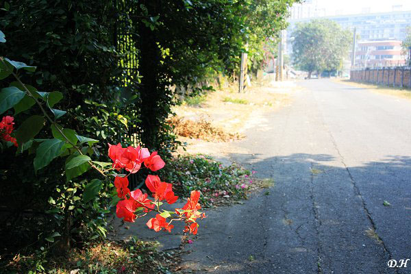 在正中午當兒,我從熱鬧的南門圓環走進幾無人蹤的眷村,彷彿進入一個被遺忘的世界,松鼠在樹上爬上爬下,庭院中的樹藤攀出到路面來開著紅花,除了沒有人聲之外,其他的事物都還活生生的存在著,讓我想到一部動畫「隨風而逝的記憶」,描述來自宇宙的外星人把地球上所有人的記憶都抹去了,地球上的所有景物都還維持現代的景象,只是人的記憶回到蠻荒的時代..。