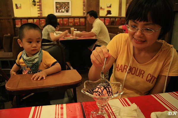 老婆點了白醬雞肉義大利麵,我點了大卷焗烤飯,而小兒分食了大部分義大利麵,我怕老婆沒吃飽,又加點了一份茄汁義大利麵給她。初時老婆對於再加點一份只說還好,但我很自動地還是去加點了。雖然後來果然吃到有點撐,不過回到家之後,老婆對我說,如果當時我沒有加點的話,她會覺得我太小氣。幸好我當時有去加點是對的,而且還跟店家要了一份壽星才有的冰淇淋。總之..男人在老婆生日的這個重要日子是一定得要巴結點的。
