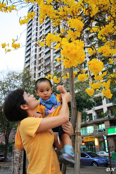 (河堤社區最盛開的黃花風鈴木與不怎麼配合拍照的小朋友)