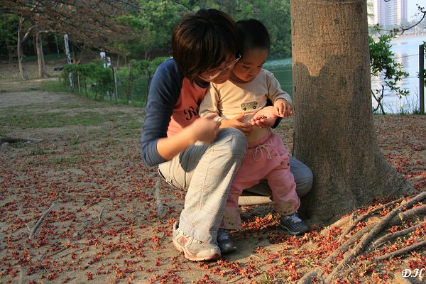 橋下水清,魚群嬉游,走過九曲橋,繞過陶然亭、豐源閣、慈暉樓數個小半島,盡覽春水碧於天的湖光美景,十分快意,然後就在下了丘的湖水岸邊在標示裂葉蘋婆的樹旁邊,有能將一地落滿小紅花的不知名的樹群,我本來是要來拍綠水岸,卻驚豔於滿地紅花,於是呼喚妻兒過來一同玩賞。