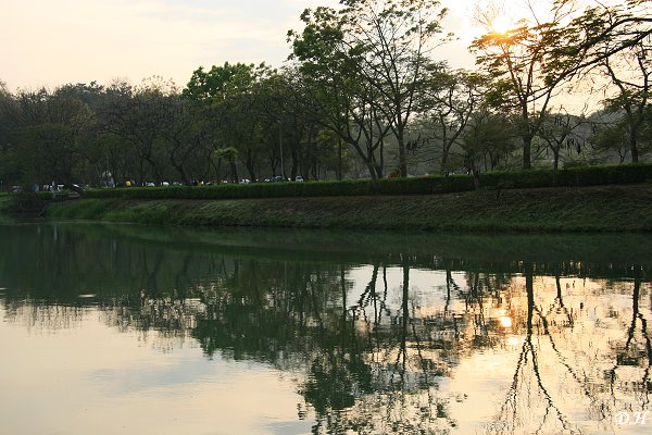 還不到蓮花開的季節,「柳堤觀蓮」無蓮可賞,倒是走往雙蓮亭途中回望柳提,夕陽金光倒映柳堤水面上頗像一幅油畫。至於來到雙蓮亭,這一側的南洋櫻枝葉低垂至水面,頗有意趣。前行又有湖岸水凹處,岸邊落葉層層,水面綠意幽幽,湖岸春樹綿延,看似置身在中國江南水鄉,又彷彿位處日本京都嵐山。