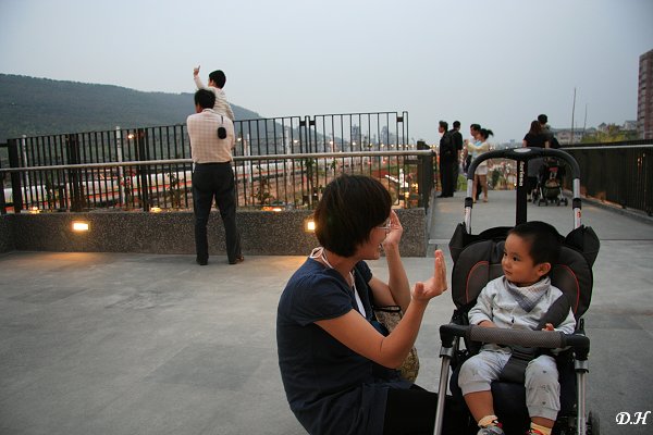 新光三越左營店的二樓有空橋連結到幸福公園,站在空橋上可以眺望花鐘與高鐵、台鐵緩慢進出站的列車,還有軌道另一側的半屏山山景,這是我覺得算是風景不錯的地方。我們從空橋走進百貨公司二樓想找吃的,像迅猛龍一樣到處覓食。這家百貨公司有個樓層正好在做恐龍展,而戶外空間也有一隻會擺尾也會發出叫聲的擬真恐龍,吸引大小朋友來合照。
