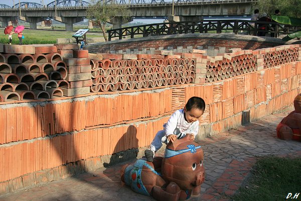 我們夫妻倆帶著小朋友走入三和瓦廠的入口,門前庭院有許多用磚瓦堆砌或雕刻出來的裝置藝術。其實關於瓦窯,我們本不陌生,因為我曾經多次記錄世紘的六甲蛇窯以及它的週邊環境美化,相同的是大家都用磚瓦堆砌去做戶外空間的擺設與配置,而三和瓦窯更多的是磚瓦本身的變化,而世紘的居廣陶有部分轉向在陶藝器皿上。居廣陶曾經以琉璃瓦為生產主力,而三和瓦窯則致力在古蹟廟宇古厝等建築的修繕用瓦上。