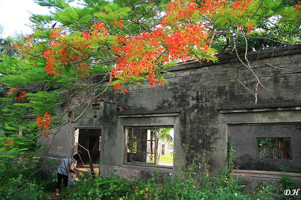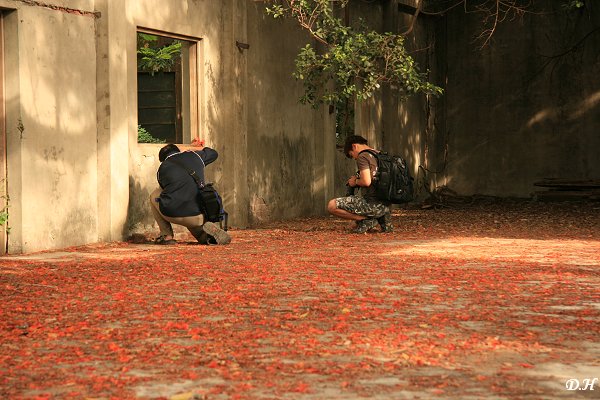 下午三點多太陽真是毒辣,騎著摩托車頂著一個小時多的大太陽來此真是辛苦,其實目的只為了不到半小時的拍照而已,廢棄的番茄會社廠房沒有什麼好玩的,對老婆小孩來說。不過如果能換個角度來欣賞廠房的頹廢與鳳凰花的盛開所形成的強烈對比,則滿地的紅花,歪斜的窗框,如大傘般的繁茂枝葉無一不可入鏡;在廠房內由下往上拍樹幹與天空或是由廠房後方拍數個並陳的窗框與覆蓋下來的鳳凰花枝葉皆是他處少見的美景。