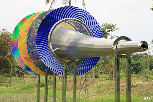 北區入口那個不知道是否為三個裝置藝術之一?另外就是在過了榕樹圈之後,有一個裝置藝術「串流」,設計的創意來自於「號角響起」。