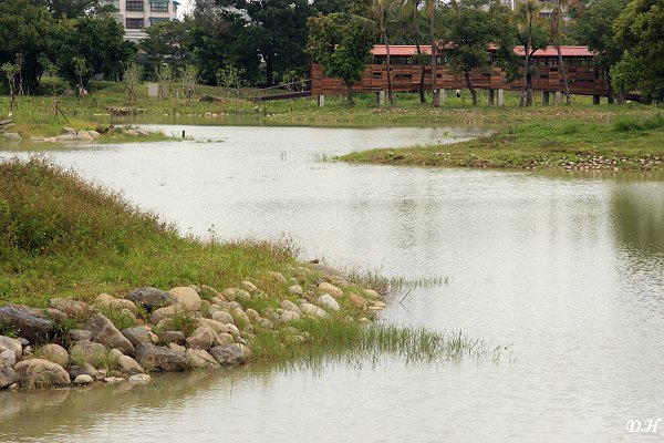 衛武營園區有兩個部分,一個是已經接近完工的都會公園,一個是正在發包興建中的藝文中心。都會公園中的園治設施都是新近完成的,如賞鳥亭、生態湖、橋、人行步道,而園中的樹木自然也不高大,且分布稀疏。幸好今天中午天色稍轉陰沉,但是沒有太多的風吹拂,仍稍感悶熱,對於要到處追著看顧亂跑的調皮小孩的大人來說有點辛苦。