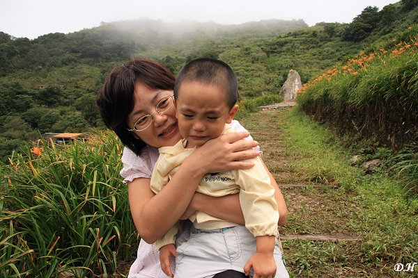 至於在這裡要如何拍金針花呢?人在花叢中的部分就不多說了;除此之外,應該要取山谷間騰昇的山嵐與細雨中的霧氣,前景最好點綴著幾朵大大的金針花,遠景中可有和緩起伏的金針花山坡,也可把忘憂山莊加入當做山谷中的映襯。大致就是這樣了,只是小兒對於在金針花中拍照似乎興趣缺缺,他比較喜歡撿地上的石頭玩兒,把他抓過來拍照,一臉臭臭的,作勢欲哭。「小朋友,難道你不知道此地名為忘憂谷嗎?」
