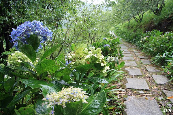 稍事盥洗後,走出農莊,撐著傘到下方咖啡雅座區去用早餐(住宿房客送早餐)。這咖啡雅座很不賴,直接面對的就是太麻里山。吃過早餐,依照咖啡雅座的主人的指示,推開一旁的竹籬笆,走下青山農場的後花園。其實老婆就是看到農場網站上介紹附近有條步道,才決定要來住青山農場的。我們這個時候來,金針花固然還沒來得及開,櫻花杏花也只有枝幹,只有繡球花步道還算美麗。只是小兒全程都賴在我身上不肯下來,我沒有三頭六臂,無法一邊撐傘,一邊抱小孩,還可以按相機。所以每次要拍照時,都要把小孩放下來,拍好再抱上來。就這樣反覆幾次,也就累了嫌麻煩了。
