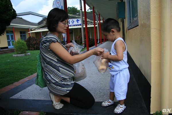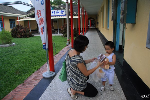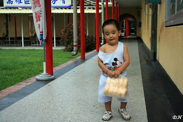 我們逛過了8巷,回到福利社附近,先去看了宏南餐廳的菜色,然後再回到福利社內大肆採購冰品。必須要整包一起買的有冰餅(1包90,內有10塊像是銅鑼燒夾心)、以及五支一包的冰棒(35元)。我們買了許多,準備要分送給妹妹一家。走出福利社,特地要小兒提著冰品拍照當留念。這個年紀的小兒,對於我們交付給他的任務一向是欣然接受的。