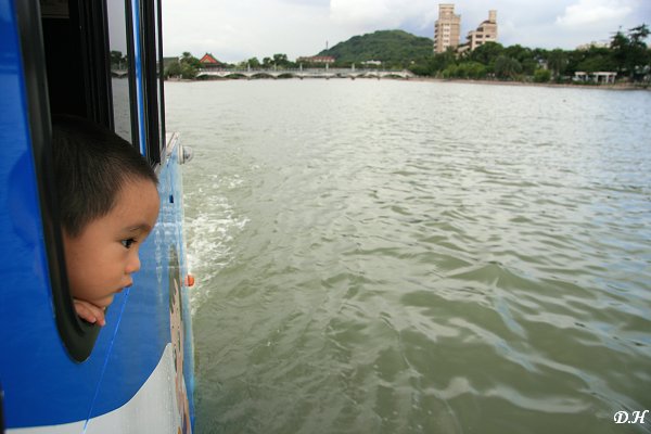 鴨子船下水後,隨著鴨子船的行進路線,依序看過洲仔那邊的清水祖師像、翠華自行車橋、蓮池潭風景管理處、龜山(導覽人員說大龜山還是管制區?)、龍虎塔、春秋閣、腳踩龜蛇的玄天上帝像,以及站在湖面浮球上的暗光鳥。小兒初時還會把頭探出窗外看風景,後來他還是回到他的最愛-在車廂中跑來跑去了。窗邊,隨著船的前進,其實還頗有涼風,只是老婆還是覺得車內很熱。