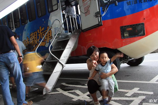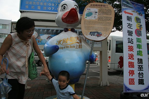回到左營站下了車,我和老婆想盡辦法要讓小兒在鴨子船前拍照留念,只是小兒動來動去就是不肯好好就範。後來在鴨子公車站牌前要跟那隻拿著鴨子船簡介的鴨子照相,小兒也不肯,就地耍賴起來。後來我們放棄了,一鬆手,他一溜煙地就跑到高捷左營站2號出口那部升降梯去,然後自己按了「向下」鍵,門果然開了,小兒就自己跑進去了。我們其實沒有要搭捷運,所以我只好趕快進去把小兒抱出來,但是這小子依然繼續在地上耍賴,現在他快兩歲,力氣大了,要抱他出來著實費了我一番功夫。抱著小兒走出了升降梯,只看到一旁悶聲不響的老婆已經氣到頭頂冒煙了。看來這鴨子船只有我一個人捧場。