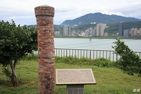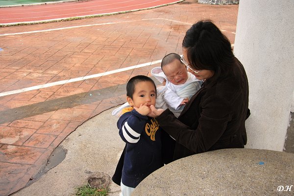 直行通往小米蟲咖啡的小徑因為木棧道施工而拉起了障礙線,改從右方廁所前進入校園。校園居高臨下展望淡水河景很不賴,尤其是操場邊緣還留有一根當初校園八景之一的涼亭石柱,站在此展望大屯山與淡水河景頗有懷舊氣氛。本想讓小兒(老大)到操場跑跑,不過他「這時」沒有什麼興致,只想賴著媽媽,他媽媽抱著弟弟沒空理他,因為弟弟肚子餓了想喝奶,結果只好先送這母子三人先回車上去,我自己再回頭進校園來拍照。離開車子時問小兒要不要跟我去操場跑跑,他還不會講話,只會搖頭表示不要。