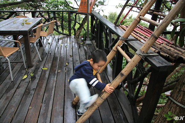 於是我又帶著小兒從坡道中途的小米蟲咖啡入口的階梯走上去,穿過小木屋、金露平台,我幫助小兒爬上通往瞭望台的木梯,上了木梯之後,另一頭是長長的溜滑梯,小兒不待我說,自己就先溜下去了,下去之後;還有另外一段,小兒同樣也溜了下去。盡頭就是主人煮咖啡的地方。小兒溜完之後,意猶未竟,自己逆向行駛,又爬上溜滑梯去,待要在爬上另外一段時,被我把他喚下來。玩夠了,我們父子倆就往出口走,這時遇到一大群男女老少都是要走進來喝咖啡的,他們說其中一個老闆剛剛還在小木屋中..。