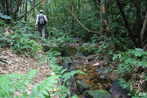 原路退回到往大寮茶場叉路,遇到兩位山友從紫微森林方向過來,說路況並不是太好。我們續行稜線山路一路下坡遇到產業道路,在產業道路走了一回,又往左切下坡,沿途有古老小石階,明顯是條古道,這一路竹林頗多或許曾是採筍路。下坡終點遇到小溪流,這應該是古道最精彩的一段,溪水淙淙、竹林翠綠、古道緣溪,旅人行走於上,頗有悠悠意境。趁有人當模特兒機會多拍幾張。