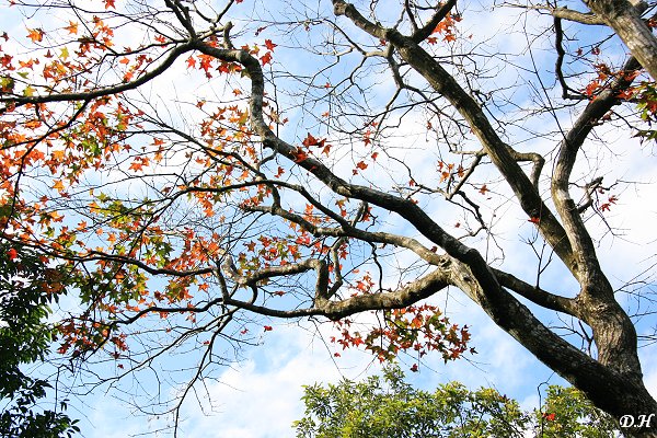 往雞罩山之路線屬原始山徑尚稱和緩,到雞罩山前峰前有一段幾十公尺的緩升,我和Tony兄行走速度仍然緩慢。地上有許多楓葉,抬頭一看有一棵楓樹,趁著試拍逆光中的楓樹,我們又可短暫的休息一下。