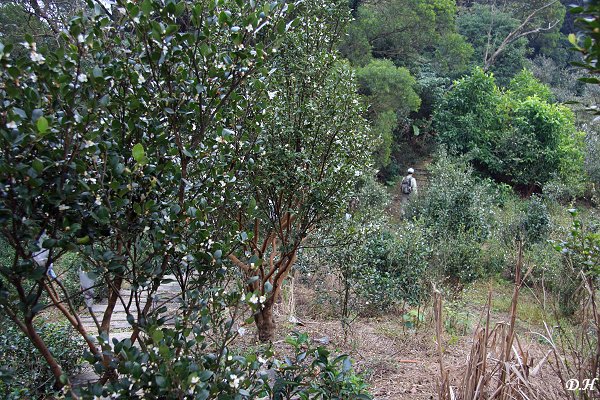 走出山路,遇到茶園,循農路小徑繼續往下經過太極園,接上聖母環山步道,在附近涼亭等候老恩兄,後來知道他已經往上要走到六寮崙,於是我們一群人續行,路過紫微森林停車場,步道在茶花園中,地上落滿茶花潔白的花瓣。走過茶花園,就來到了原來的六寮崙西南峰。為什麼說是原來呢?因為此處現在已經被正名為六寮崙了,大概是這裡有一顆總督府圖根補點,而原來的六寮崙那裏的基石已經遺失。