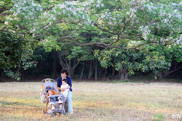 不過此時此刻大概只有我一個人想浪漫,於是攜妻帶兒來到苦楝樹下,這整棵開著紫中帶白的苦楝樹,竟然也頗有流蘇白雪的意境。這時老婆也樂了,坐在樹下與二子一同悠閒看花,其實是要我幫他們取個好畫面入鏡。除了樹下看花的構圖入鏡之外;另一側有一枝幹帶花低垂及地,老婆小兒三人擺出輕鬆賞花姿態也要拍照,可惜大寶只想快快逃開無意附庸風雅。