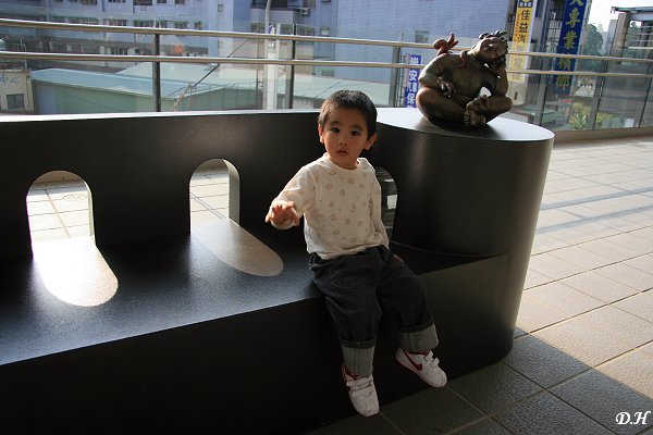 我們搭高捷紅線北上,經歷了比我預期中還要多的站,來到都會公園站。都會公園的月台上有像是椅子的裝置藝術,上面有像是小天使還是小惡魔的雕塑。小兒乖的時候,就是小天使;大人在忙時偏偏不乖,就像是小惡魔了。對於小兒來說,捷運站就是旅程的終點,他享受的是進捷運站感應卡片、自己按電梯,看車廂中的LED顯示的搭捷運過程。因此當我們走出捷運站朝都會公園走去時,他就有點老大不願意了。