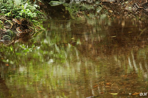 至於邊石苔綠的可愛,錯落於綿長的步道石階兩旁,因此形成的線條或圖形,也變成我構圖的目標。至於積水所形成的小小溪,水流滑過樹根之間的韻律,或是靜待波動前的水平面倒映綠光彷彿油畫的多彩,則是新奇的發現。而上山略為幽暗,下山看見穿透的光亮,同一條步道呈現兩種不同的樣貌。甚至連回到第二停車場取車時,看見相思木的黃花落一地,也有所感。於是今天的取景構圖不用多用頭腦,自是信手拈來。