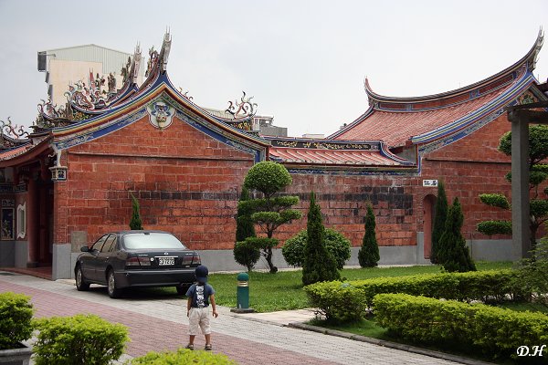 走出到博愛路上,路對面,也就是環保公園旁停了三台計程車,司機都在一旁從事無聊的娛樂。至於旁邊的蘭陵學堂(蕭氏以蘭陵為堂號)牆壁也塗上了大紅大花的彩繪,而且好像也是社區關懷的據點。不過看來並不是古蹟的樣子。跟計程車司機說要坐車,請他把車開到蕭氏宗祠,果然這個司機聽不太懂。