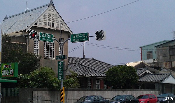 續沿著廣東南路往西行,看到路對面有一間福德祠。福德祠後方有許多紅磚老宅,其中之一的牆上還有「台糖」兩字。