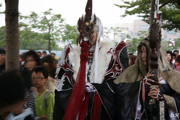 好不容易走出捷運站外,朝時代大道的方向走去。遠遠看到有一個Hello Kitty的大熱氣球,看來大氣球遊行還沒落幕。不過後來走進聽到廣播,才知道這來自日本,身穿吊帶褲的Hello Kitty是今天的壓軸走秀,其他卡通明星的大氣球都已經走過。動線設計是走時代大道,從中山路這一端往西走到夢時代前的活動舞台前。大氣球移動的方式是,大氣球升空後,由氣球底下的十多名工作人員以繩索牽引往同一方向前進。就像是奧列佛遊小人國的場景。