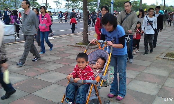 本來也沒有堅持要出門,後來大寶又願意出門了,所以我們這一家來到捷運站,搭乘捷運紅線來到凱旋站。這時已經下午四點半,凱旋站擠滿從遊行會場出來的人潮要買票進站搭乘捷運,如果不是小孩們幾乎人手一個open將的氣球,這人群看起來還真像在逃難。我們正好跟他們行進方向相反,推著嬰兒車不易前進,在人潮中擠得人仰馬翻。開始後悔為何要來湊這個熱鬧。我根本沒有預期到參加這個活動的大人小孩會這麼多。