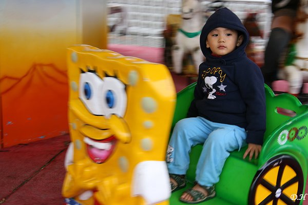 至於大寶正襟危坐在海綿寶寶車上,一動也不動;跟他揮手招呼,他也沒反應。表情實在很嚴肅。等到五分鐘一到,旋轉木馬結束了,我把他帶下來,他才又頻頻回頭說想要再坐。