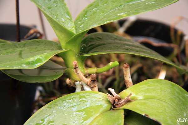 黃花紅心此次未能結出花苞,大概是放在樹下,日照不夠,又受到雨淋的關係。另外大舅之蝴蝶蘭從花梗處抽出新芽,倒是少見。一株石斛蘭亦從莖節處長出新芽株。過了中秋,開始將幾棵植株從樹下移到屋簷下。 |