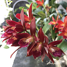 - 1999.07.05 兩株系出同源的卡多利雅結出花苞(一株三朵,一株兩朵的紅花).事實上從未期望他們開花,這兩株花的母株(歷史可追朔至剛種蘭花之初)是曾被人認定為感染病毒的植株(雖然外表看來假球莖一直是那麼健壯).所以這次所分的兩子株竟然一起開花額外令人期待.另外只花了十分鐘左右就幫一株虛弱的蝴蝶蘭由大盆換為小盆,所謂天下無難事只怕有心人.至於能不能存活下來,接下來就要看花本身的造化了.