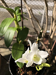 - 1999.01.01 蝴蝶蘭(白花與科伯的Amabilis)抽出花梗更長了,棉花蟲依舊又附著在虛弱的幾株巧克力植株上,於是將其移到圍籬旁,並清除腐敗生青苔的水草.另外一株卡多利亞,病況嚴重,只得整株換盆並整理其根部.冬天換盆雖不合時宜,但亦不能任其繼續濫下去.這次的好消息是:黃花紅心的卡多利亞經過整理後(1998.10.11),假球莖終於茁壯起來了.