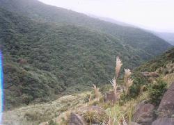 選擇此路,穿過樹林後出來,看到八連溪谷,與滿山遍野的的....芒草,不是紅楓。然後在芒草前方大岩石上有兩個小夥子,就是那兩台機車的主人了吧。跟他們談起八連古道之後的路程。他們說:
