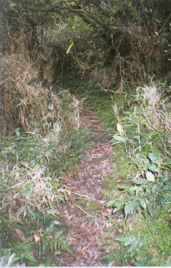 往前又行一會,已無柏油路,但見兩台機車停在附近﹔而右側芒草中一條明顯小徑直入矮林中。不用太費心於撥開兩旁芒草,反而要注意類似水溝的泥土小徑的濕滑。十多分鐘後,來到一處叉路,左側上坡卻有較多登山條,且樹上有八連古道指標。