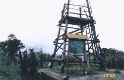 從電塔下了小坡,四面都有叉路來會,除了直上望高寮山三角點的路之外,還包括往市民農園的,有往栳寮古道的,另外比較奇怪的是有一條新築的枕木步道向右下方延伸。關於在山中營造這樣一條枕木步道對山林所造成的影響,對此有不同見解的我跟導遊小姐後來有了一番討論。不一會兒上了望高寮山,山頂眼前所見之紛亂施工景像讓曾到過此處的導遊小姐頗為失望,至於我因為是第一次來所以無法像此處曾經有過的美好展望。據導遊小姐所言,山頂以前曾有一木造的登高塔台,登上去後望遠可以俯瞰南港、石碇附近的山景,是以此山名為望高寮。而現在山頂原有的木寮拆掉了,竟然蓋起了不倫不類的涼亭,雖然說是為了發展觀光,不過總覺得跟我們一路尋幽訪勝而來的自然不太搭。我自己在爬四分尾山時看見山頂旁就有一條產業道路通過而嚇一跳時,大概就是這種不搭調的感覺。