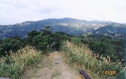 差不多走了二、三十分上到了稜線,本以為路會開始平坦好走...﹔此時卻但見左右各有一條叉路,而且都有綁登山條,而路中樹上有一望高寮的指標指著往右的方向。導遊小姐因此說:我們往右走吧。不過我卻說應該是往左才對。原因之一是,那個指標已經是倒過來掛﹔原因之二,看過山下地圖的我,覺得望高寮山應該要順著稜線往左走才對。結果這一次是我對了,不過也只有這次而已...。開始沿著稜線走,路高低起伏不大,只是經過一個夏季,雜草蔓生至腰的高度,山徑稍被湮沒,因此也讓導遊小姐直嚷嚷這樣的路似乎不是她以前所走過的樣子。就這樣一路在我帶領下,穿出樹叢來到另一座高壓電塔(這裡山區稜線上的特產),因為含水的關係,電塔上的電線高壓電蒸發水(?)發生嘶嘶的聲音﹔導遊小姐不忘取笑我上禮拜在新山夢湖把高壓電塔發出的嗡嗡聲當作人吶喊聲的事。