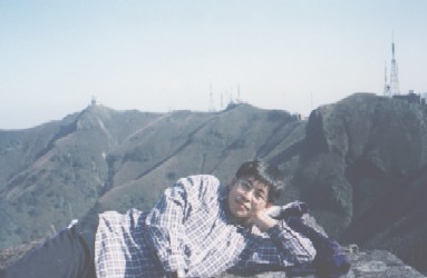 走到這裡,前方似已無路,這時我們又開始吃水果了。導遊小姐說,走的不過癮,都還沒流汗,連蘋果吃起來都覺得不怎麼甜。女人啊,妳的名字叫善變。總之,導遊小姐提議說,再回到西峰,從山頂直下到火山口底部溪谷,再從對岸回到對面主峰頂的電台,如何?其實,我還是不太習慣,剛才一個直嚷嚷路難走的人,怎能突然變的興致這麼高?反正時間才不過14:46,就下去走一遭看看也無妨,不過我倒是prefer原路折返。