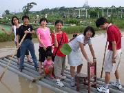 在Sarah的姊姊帶領下,來到一處佔地似乎更大的新屋蓮園,其實也是一個觀光農場的模式:蓮田裡可以釣蝦,有幾艘竹筏可以在溝渠裡撐著玩。農場裡放的音樂是流行台語歌曲。也舉辦小朋友繪荷比賽。其實藉著賞蓮、賞荷的名義來發展觀光農業也沒有什麼不好。但是只要當某種東西被發現有利可圖,有一群人一窩蜂的湧入這個市場後,又是一場優勝劣敗的淘汰賽。就好像當初的蛋塔一樣,熱潮一過,終究必須要受到市場嚴厲的檢驗,唯有不斷有創新創意的人能夠生存。