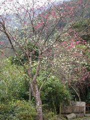 從溪谷回到吊橋倒是很快。來到民宿村附近,路轉角處有一株開著白花的櫻花樹。再上到養鳟場中又見同時開著紅白兩色花朵的櫻。 白花在烏來村比較少見,所以在福山看到會覺得稀奇。