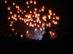 好不容易擠到平溪國中,但要到運動場上的會場竟還有人潮管制。不過要對千燈並起照相取景,當然還是免不了要擠這麼一遭。會場熱鬧程度無須贅言,千燈並起也著時令人讚嘆。然而見到眾多天燈飛向一輪皎潔明月旁邊時,又是令一種感動。