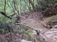 我所帶的水,在爬中峭壁時因為背包拉鍊沒拉好而從背包中掉出,一路順著陡坡不停地滾,滾到....不知何處去了 ;幸好底下大概沒人,不然這天上掉下來的,可不是一件禮物。而我只知像這樣陡峭的山壁,姑且不論水是否可找到;如果叫我下去又再爬上來一次,相較之下我寧願忍受登山無水的渴望。