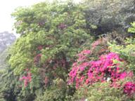 黃禪園,庭園與小樓、小橋流水格局;附近紫色九重葛與綠林相映成趣。
