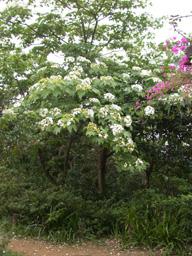油桐花開四、五月間,有油桐花盛開的山坡有如雪覆蓋般一片白。選擇在土城油桐花季的最後一天,往南天母而去,想順登天上山系群峰。這次的主辦單位規劃了五條賞花步道,地圖畫的雖精美,但不易讓人了解,主要是車道與步道的相接處不清楚,容易讓人混淆。