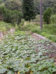 既然已經開口問路,就順便跟當地人閒話家常,四處看看他們瓜田中種的菜瓜、小黃瓜,也有許多野菜,還種許多野果....。有個小孩大概是少看到外面的人特地來登山,對我似乎很有興趣,拿著水槍追著我往我褲檔直噴水,他的婆婆追在他後面要阻止....。這明天宮附近的週末下午實在是很悠閒。而這份山下的悠閒跟後來我沒有爬上那蝙蝠山,還是一點關係也沒有。聽說山頂展望絕佳....,這次還真是浪費了。