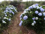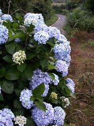 繼續在這條路上走著走著,虎豹潭還沒到,先在一路彎處小吃店看到路旁一大片..花叢。這花在其他地方也不是沒看過,只是這裡花朵多又大且整齊,顏色有淡藍、鵝黃..,數目眾多可以形成花牆。跟小吃店的老闆與兒子打招呼說要幫花照相,又稱讚他們的花很漂亮,順便問問虎豹潭還有多遠,於是又開始另一段閒話家常。
