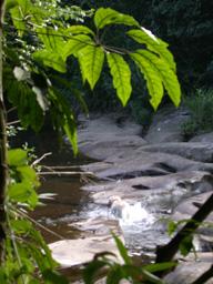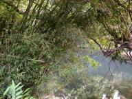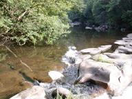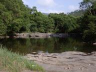過了岩盤,繼續緣溪行,過了一處溪彎,岸邊有處竹林低垂,而潭邊更形幽靜,野薑花族群更是肆無忌憚地在河岸邊蔓延開來。有一家子在此遊憩,有人垂釣 ,有人索性在樹下午眠。不知道是誰家的小白,是因為怕熱還是嫌路難走,乾脆直接跳到溪裡面玩水去也。