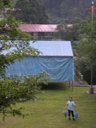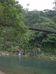 闊瀨國小在北42,14k 附近,除了真是個露營的好所在之外,旁邊的北勢溪谷真是精采,有湍急、有和緩;有碧綠溪水、還有雨後新瀑。沿著溪邊有條小徑,不遠處岸邊有一頭頂簑笠者,獨釣這一溪細雨綿綿。不過我卻不能在此多 作停留,因為有人為了晚上的約會正歸心似箭。