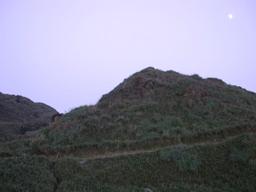 回到金露天宮上來的步道旁的展望平台,就著夕陽向晚天,卻看半圓明月從山邊升起;一個柚子被人更圓給吃掉了。